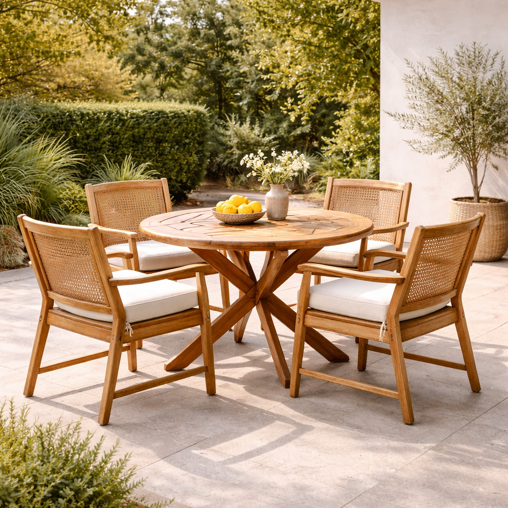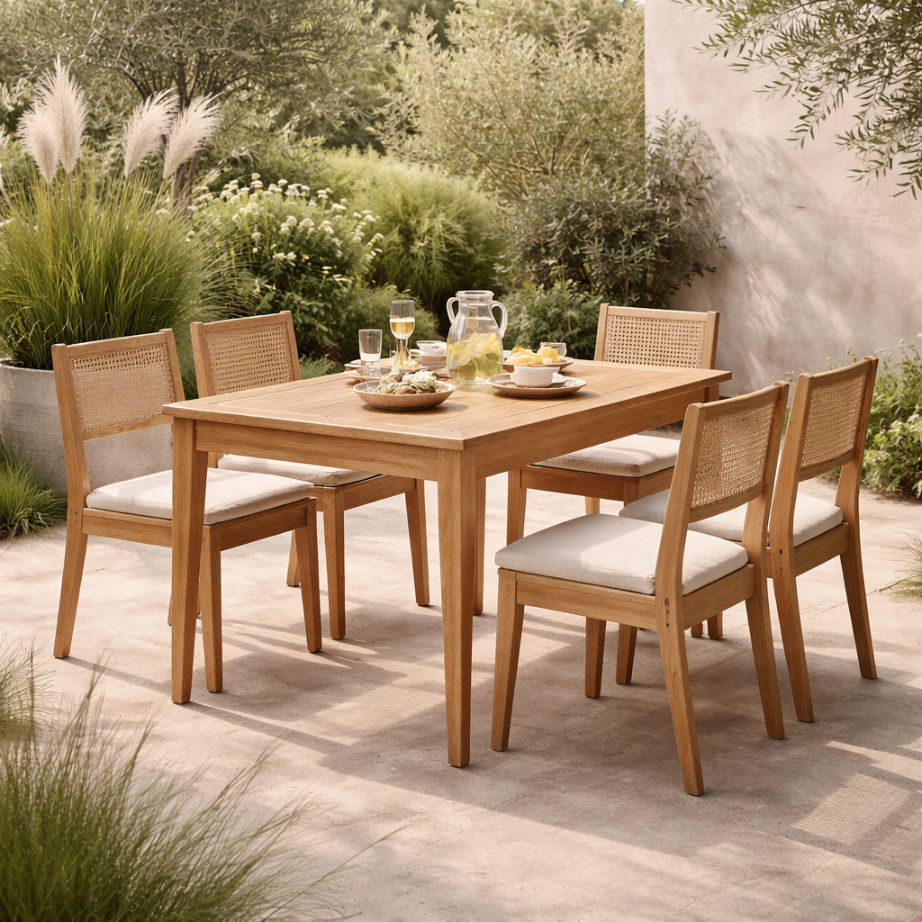 Un ensemble table et chaises pensé pour vos repas en famille, vos cafés au soleil et vos soirées d’été.
