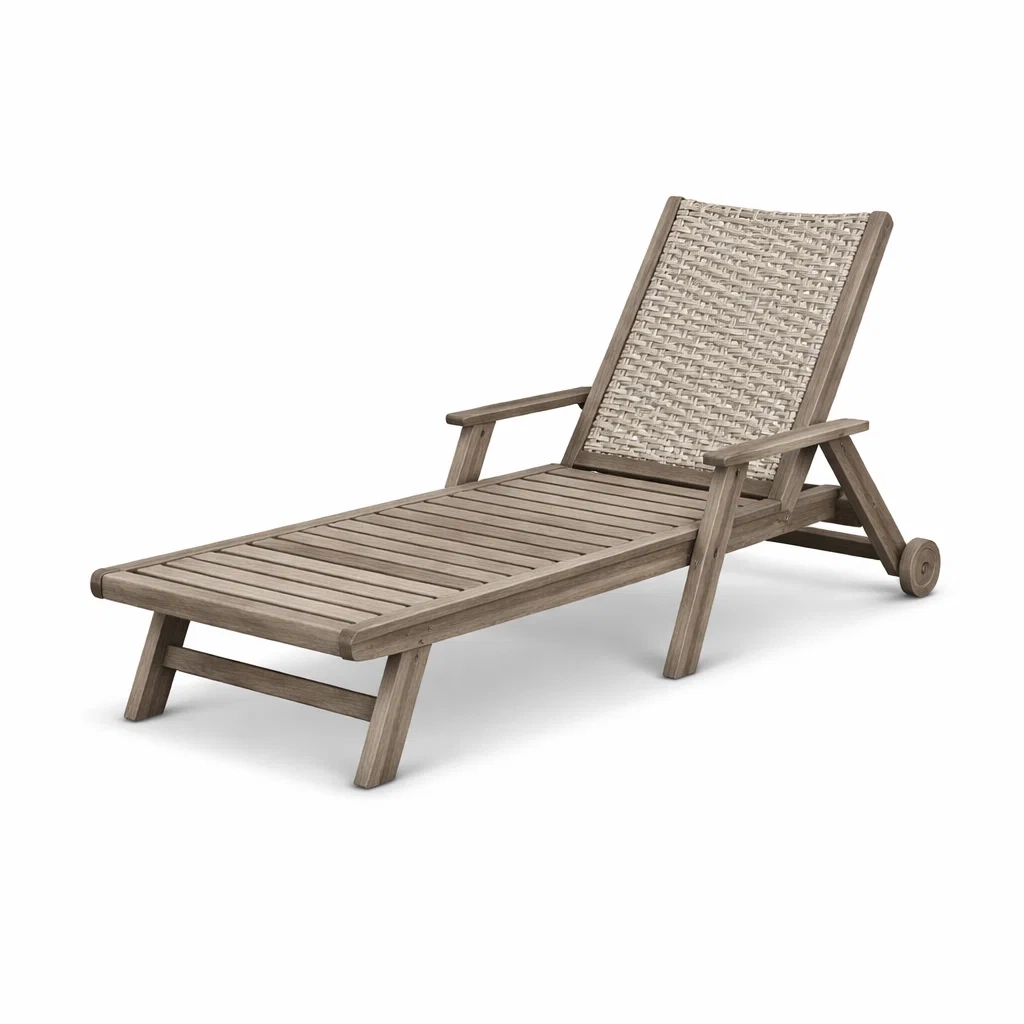 Chaise longue en bois d'acacia avec dossier en résine tressée. Dimensions : 200 cm de longueur, 65 cm de largeur, 95 cm de hauteur. Poids : 18 kg. Équipée de roues pour un déplacement facile. Dossier réglable en hauteur. Capacité de charge : 120 kg.