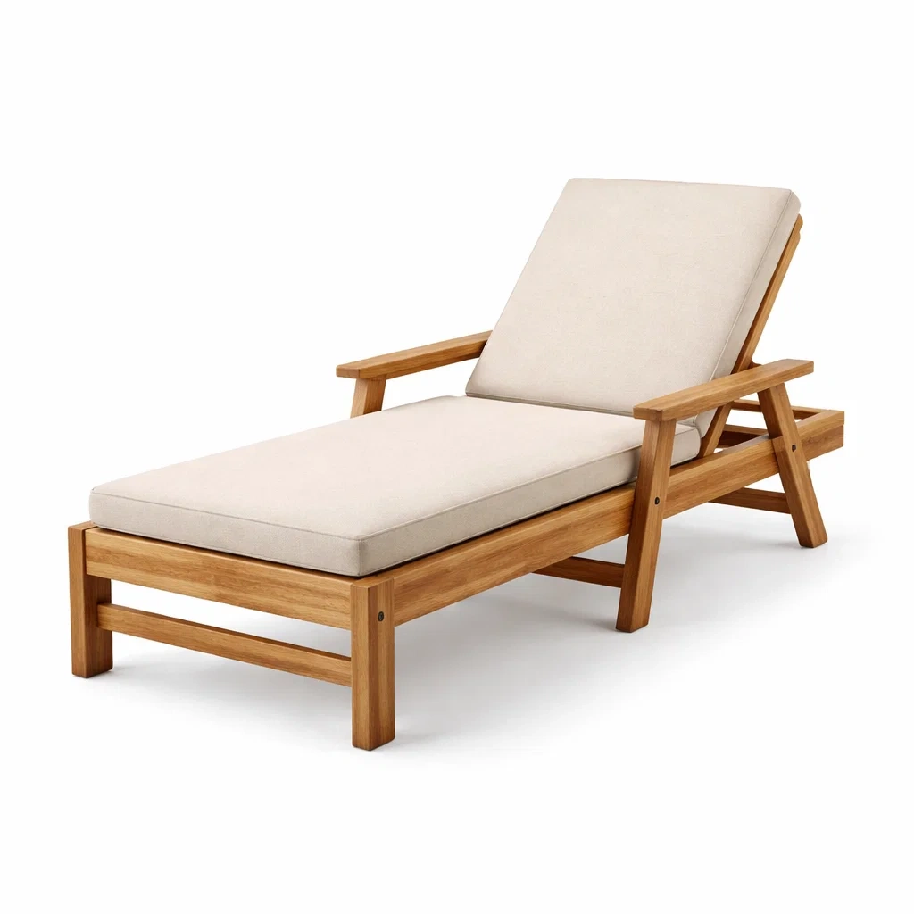 Cette chaise longue est fabriquée avec une structure en bois de teck. Le coussin est fait de tissu polyester.