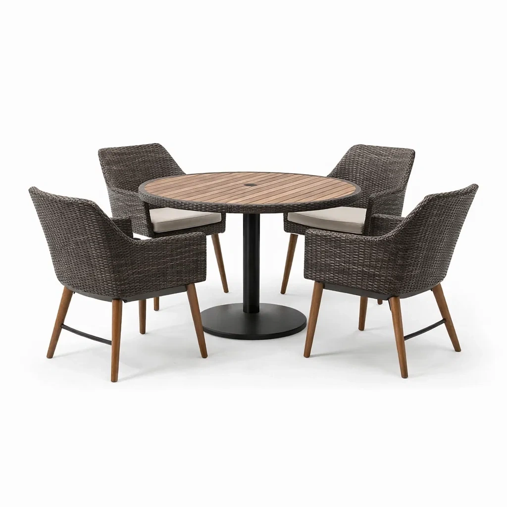 Table en bois massif avec structure en métal. Chaises en résine tressée avec pieds en bois et coussins en polyester.