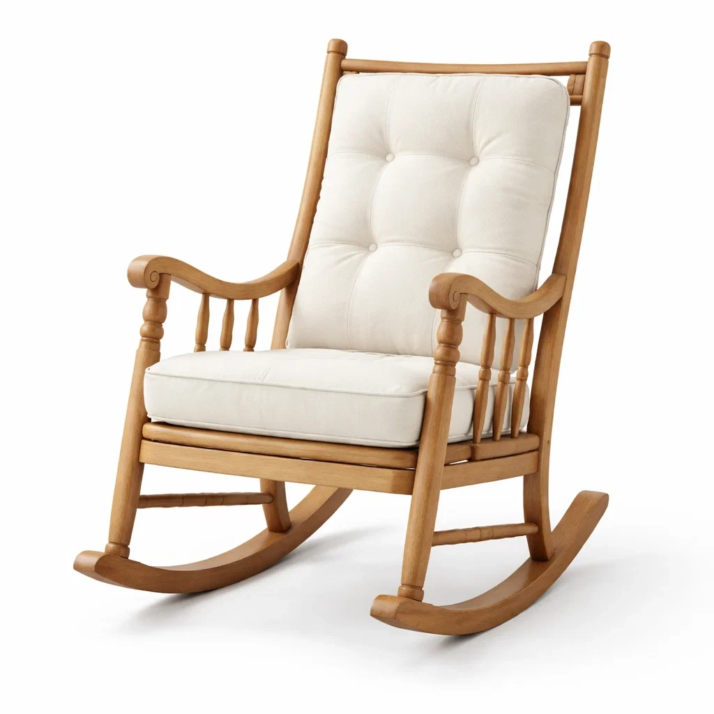 Structure en bois de hêtre avec une finition naturelle. Les coussins sont fabriqués en tissu polyester, rembourrés de mousse polyuréthane pour un confort optimal. La chaise dispose d'une fonction basculante en douceur.