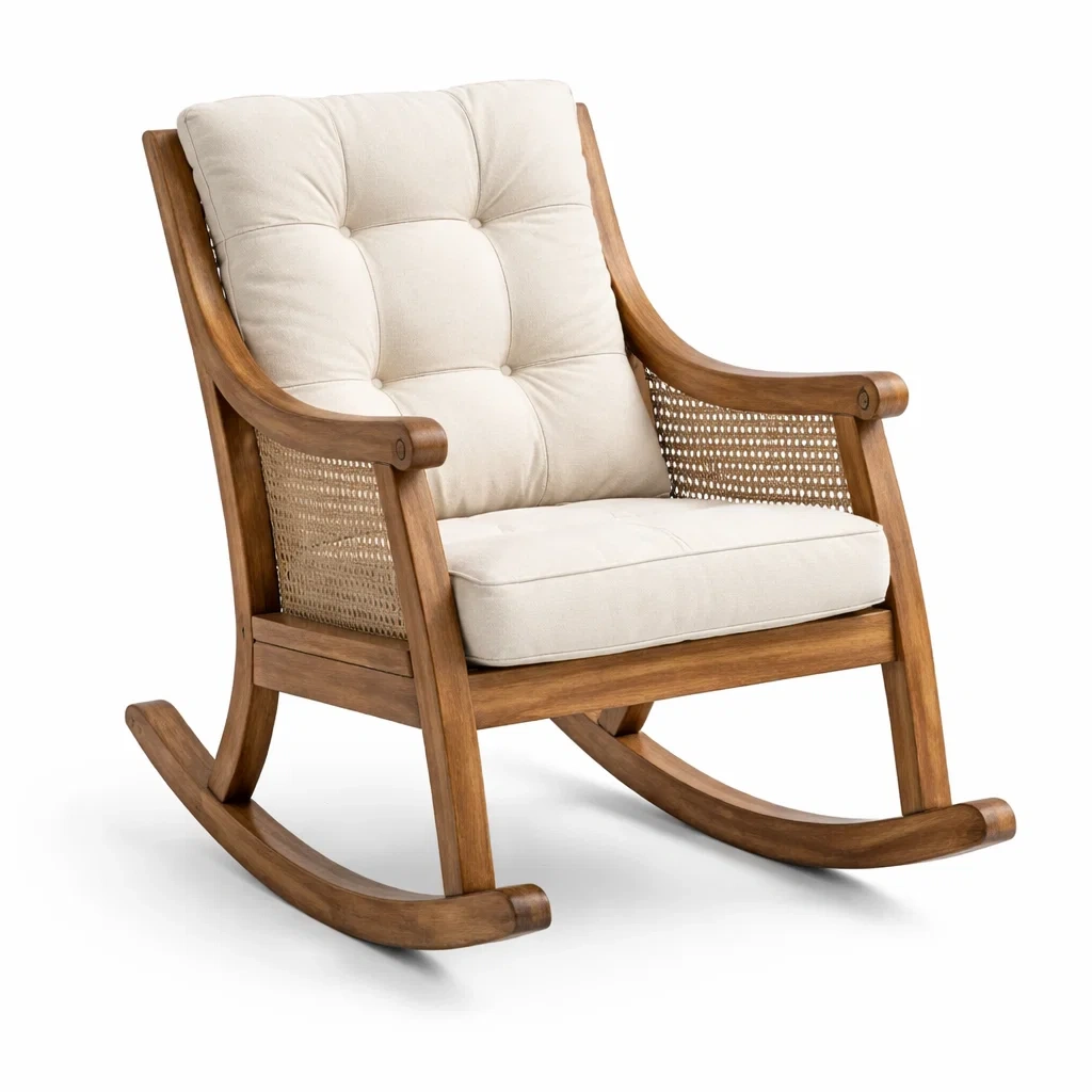 Fauteuil à bascule en bois avec rotin et coussins en polyester