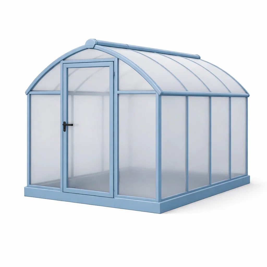 La serre de jardin est fabriquée avec un cadre en aluminium et des panneaux en polycarbonate de 4 mm d'épaisseur, offrant une transmission élevée de la lumière. Elle mesure 300 cm de long, 200 cm de large et 200 cm de haut, et pèse 60 kg.